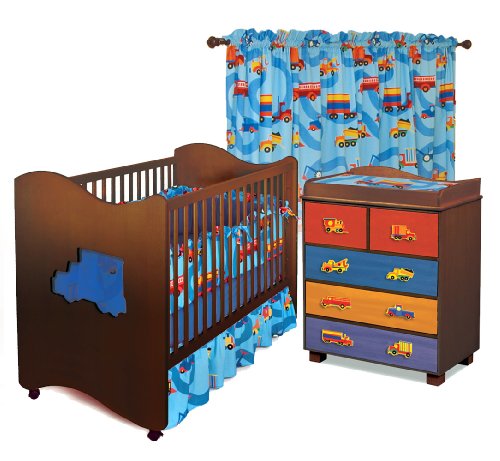 RM122-BTD Crib pictured in White Features: -Set includes Crib / toddler bed, crib bedding set, five drawer chest with changing table tray, changing pad cover and window panels. -Crib bedding set includes bumper, solid crib sheet, crib comforter and gathered print crib skirt. -Crib / toddler bed is made of solid hardwood and veneers. -Five drawer changing table is made of solid hard wood. -Bedding set is made of 100pct cotton. -2-in-1 crib has truck shaped colored plexi-glass window in the headboards and can be converted to a toddler bed. -Fits standard US crib mattress (not included). -Includes four sturdy casters, two are locking. -Crib is US safety tested and approved. -Chest has reversible drawer fronts. -Removable changing table tray . -Includes two sets of knobs, eight trucks and eight wave knobs. -Changing pad cover fits standard changing table pads 32'' x 16'' (sold separately). -Included two set of 84'' H x 59'' W window panels. -Colorful contemporary styling. -Coordinating accessories like the dump truck lamp, nightstand, truck wall mirror and the truck toy box (sold seperately). -One year warranty. -Assembly required.